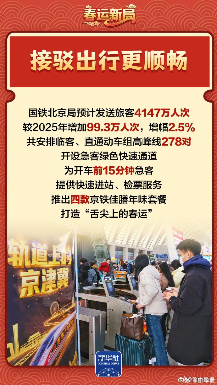 #回家之路铁定温暖#[春运新局!#这些新增的春运服务铁定温暖#]2026年春运大幕今日开启。预计全国铁路客运量将达到5.4亿人次。这次春运将实施新的列车运行图,增开和优化旅客列车560余列。各地铁路部门纷纷推出特色服务,“铁”定让你的回家之路更加温暖。跟随海报,一起来了解下。#2026春运开启#(新华社)