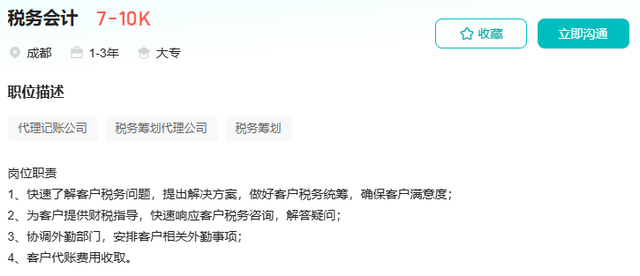 比如:同样是会计岗位,同样在成都,同样1-3年工作经验,大专及以上学历,税务会计的薪资待遇比会计的更高。